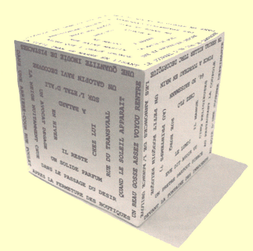 Paris en cube est un texte écrit dans l'espace, non pas sur une feuille de papier mais sur un volume, un cube, permettant d'échapper à la lecture séquentielle qu'impose la mise en page (que l'on lit de gauche à droite et de haut en bas) pour offrir une multitude de parcours possibles. Paris en cube est joint à ce mail. Je pourrais présenter l'objet, lire les textes et serais enthousiaste à l'idée d'en développer avec vous une version électronique dynamique si cela vous intéresse.