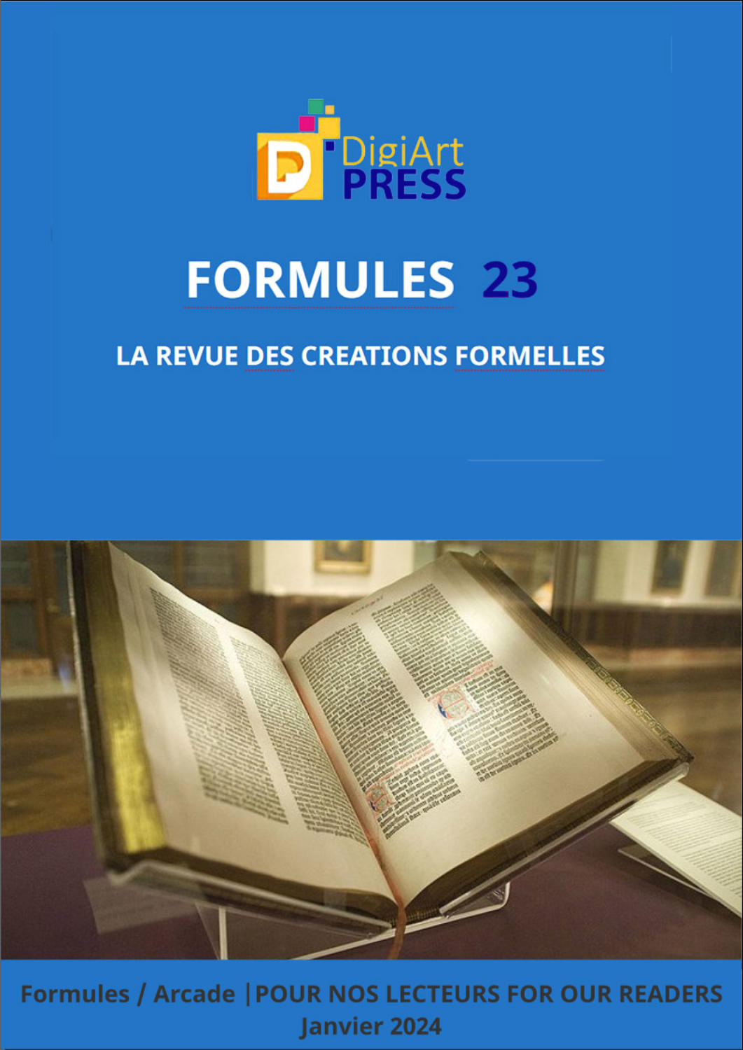 FORMULES, la revue des créations formelles, est une revue indépendante créée en 1997 et publiée par les Presses Universitaires du Nouveau Monde et DigiArt Press, Inc. avec l’aide originelle de la Melodia E. Jones Chair de la State Universityof New York.Adresse électronique :formulesarcadewebmaster@gmail.com Facebook: https://www.facebook.com/Larevueformules/Adresse internet :http://formulesarcade.net/Fondateurs /Founders :Jan Baetens et Bernardo Schiavetta Directeur-gérant /Executive Editor :Jean-Jacques ThomasConseilderédaction/PeerReviewers:JanBaetens,PhilippeBootz, AnneF. Garréta,AlainSchaffner,LucileHaute,Virginie Tahar,PeterConsenstein, Mireille Ribière, Paula Klein, Dominique Raymond, Jean-Jacques ThomasResponsabilité graphique / Graphic Editor : Jennifer Ward, DigiArt Press Nous tenons à remercier Nikita Iziez pour la contribution de sa conception unique de la couverture de ce numéro.