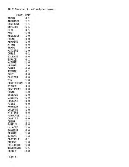 features: 1) Finiteness. […] 2) Definiteness. […] 3) Input.4)Output. […] 5) Effectiveness. », Knuth, Donald E., op.cit., 4-6.8Borges, Jorge Luis,« La Bibliothèque de Babel », Fictions, Traduitdel’espagnolparP. Verdevoye,Ibarraet Roger Caillois, Paris : Gallimard, 1983.9Nous traduisons :« It is interesting,still, that the collectionisfinite.Theentireandultimatetruthabout everything is printed in full inthat library, after all, insofar as it can be put in words at all.», Quine, Willard Van Orman,Quiddities:AnIntermittentlyPhilosophical Dictionary,Cambridge, Massachusetts:The Belknap Press of Harvard University Press Cambridge, 1987, 224.10Nouspourrionsrapprochercetaspectde l’expérimentationdel’épuisementdePerecdansPerec, Georges, Tentative d’épuisement d’un lieu parisien, Paris : Christian Bourgois, 2003.11Rouffineau, Gilles,«Effets de codes, éprouver le temps », dans Lartigaud, David-Olivier (dir.), Art++, Orléans : Hyx, 2011, 155-177.12Consultable en ligne, https://libraryofbabel.info/ [consulté le 18/09/2022] et http://babelia.libraryofbabel.info/ [consultéle 18/09/2022]