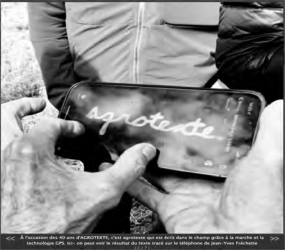 opèreenquatreétapes:ladéstructuration,lapurification, laréductionetlafixation.7DansL’Arpenteur,quatre espaces/lieux/territoires sont impliqués :le champ de Saint-Ubalde,lequartiergénéraldeFréchette,leCentre d’expositionTOPOetl’œuvreWeb.Surchacund’eux, une étape semble avoir été franchie.Déstructuration : au champOutre le fait que l’espace naturel, le champ de Saint-Ubalde, soit le même qu’en 1982, ce qui demeure enraciné dansL’Arpenteur–etquiillustrelapartdecréativitéet d’originalitédecesprojets–c’estbienl’usageduchamp commesurfaced’écriture.Or,cettesurfacedevienttout autre en même temps :la matière première subit la déstructuration.D’abord,laterreestmoinslabouréepar quinzemachinesagricolesquefouléeparuneseule personne. L’écriture se devait d’être cursive, car connectée par la technologie GPS Freehand,8chaque pas laissant une tracesurlapageWeb.Enplusdecettenécessité, remarquonsquecetyped’écrituretendàreprésenterle traitdelamainquiformedeslettresattachées,alors qu’inversement,latypographied’Agrotexterappelle l’empreintedelamachineàécrire,régléeaumillimètre près.