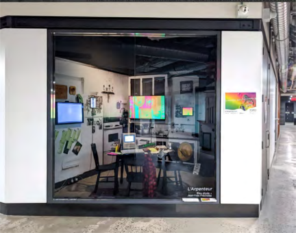 Robert),lamétonymiesenommesynecdoquelorsque cetterelationnécessaireestdel’ordredelapartiepourle tout12,quiappelleainsi,etentreautres,unmécanismede réduction.LeCentredecréationsnumériqueTOPOsesitueà Montréal,àplusde220kilomètresdeSaint-Ubalde.Ila pourmissiond’accompagnerlesartistesenleur fournissantoutils,moyens,espacedeproductionetde diffusiondesprojetssouventcollectifsetversésdansles artsnumériques.PourL’Arpenteur,TOPOresteunatout majeur:d’une part, il héberge l’œuvre Web sur laquelle nousnouspencheronsdanslaprochainesection,d’autre part, grâce à la Vitrine, unespace d’exposition situé au rez-de-chaussée,ilreprésente,defaçonréduite,condenséeet temporaire,letravaildeFréchetteetdeBleudiode.Du9 septembreau30octobre2022,laVitrineprésentait,dans uneconfigurationmétonymique,lequartiergénéralde Fréchette :