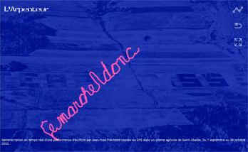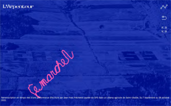 Ledispositifincitelalectureàémettredifférentes hypothèsesquantautextequiseraaffiché,lesquellesse confirmentounonaufuretàmesurequeleslettressont formées.Rarementletempsdel’écritureetletempsdela lectureaurontétéaussiéquivalent.Lalenteurpermeten plusd’explorer,d’analyser,d’interprétertoutcequi supporteletracésurlapage,enparticulierl’imagede fond,quirestestablependantletracémaischangesila page est rechargée.L’œuvreWebfixedoncAgrotexteetL’Arpenteur sur plusieurs plans. Elle se constitue elle-même en archive, parlamatièresource(certainspéditextesde2022, certaines images de 1982) qu’elle rend disponible sous une autreforme,etce,jusqu’àladisparitiondusite,siellea lieu.L’artperformanceestpardéfinitionéphémère:le tempsd’uneexpositionestcompté,circonscritpardes dates de début et de fin, tandis que l’existence d’une œuvre Webn’apasdeduréelimitée,àmoinsd’avoirété programmée comme tel, ou que l’équipement (matière sur disquedur,parexemple)sedétériore.Deplus,l’œuvre Webfixeensemblelesdeuxperformancesetlesfait fondreenuneseule,commel’illustrentlesdernières capturesd’écran:photoduchamplabourésurlaquellese superpose le tracé nouveau qui permet la lecture