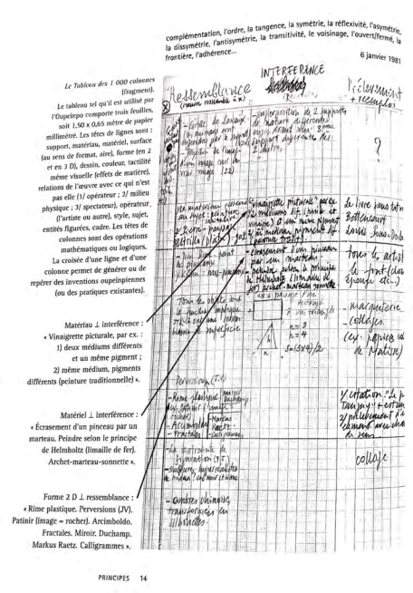 d’artistescomposéd’IsabelleGagnéetStefanBuridans, aliasSven.L’écriture pédestre est doncconnectée:les données géolocalisées des marches en lettres cursives sont extraitesetreproduitesdansuneœuvreWebinédite diffusée en temps réel dans la vitrine du Centre de création numériqueTOPOàMontréal,puisdisponiblesousun autreformatethébergéesurlesitedeTOPO.Ausol, aucune trace :le texte est apparent pour l’internaute seulement.Loind’êtreunereproductionetplusqu’une actualisation,lepassaged’AgrotexteversL’Arpenteur manifeste une réelle transmutation alchimique qui ne peut fairel’économiedelatechnologienumérique,dansses moyenscommesafin.Nousanalyseronsleprocessus,en nousarrêtantsurlesprocédés,lesidéesetlesconditions nécessairesàlatransformation.Cefaisant,nous envisageronsl’alchimieopérativedecettetransmutation, baséesurlesprocéduresetlesopérations,commeune versioncontemporained’untravailauGrandŒuvretel quel’entendaitFrançoisLeLionnais,ingénieurchimiste deformationetco-fondateurdel’Oulipo.Lorsd’une réunionquirelançal’Ouvroirdepeinturepotentiellele6 janvier1981,LeLionnaisprésenta,pourlapremièreet unique fois, ce qui deviendra le « Tableau aux 1000